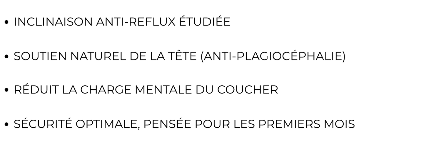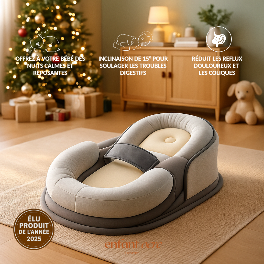NidOcre™ bénéficie d’une inclinaison douce et ergonomique à 15°, idéale pour faciliter la digestion et réduire l’inconfort digestif, les reflux et les petites coliques.